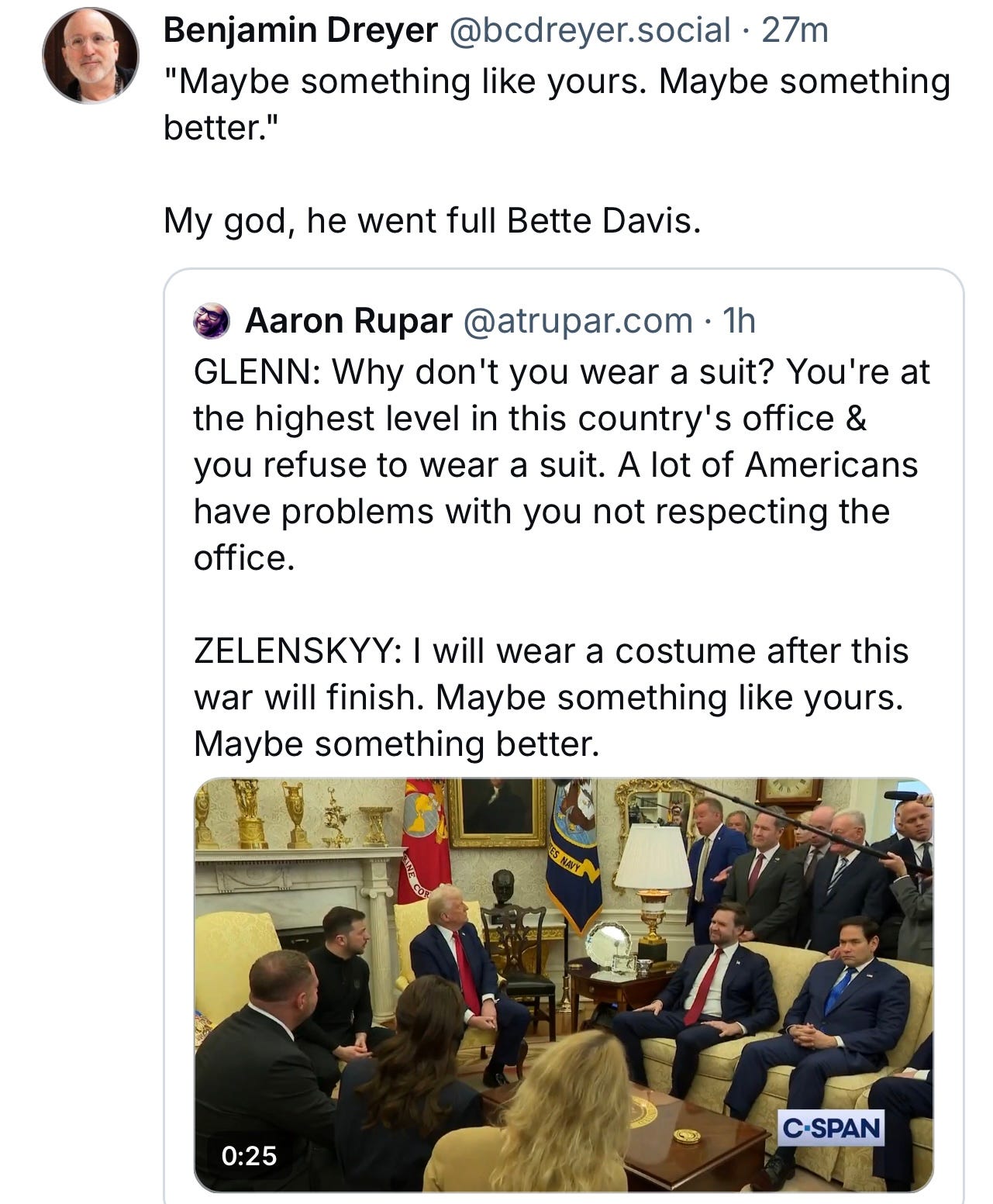 I don’t know how Zelensky kept his cool. Totally outnumbered and set up, a weaker man would have caved. And MJT’s boyfriend, the idiot who asked the “dress-up” question, I guess missed the Oval Office appearances of Musk in casual clothes and FUCKING SUNGLASSES! This all has to be a dream.